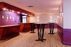 - Room amenities: full-size fridge, microwave, small counter space area, tables and chairs